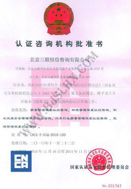 北京三聯(lián)恒信咨詢有限公司是在工商行政管理部門登記注冊,經(jīng)國家認監(jiān)委批準備案的ISO認證咨詢機構(gòu),批準范圍:質(zhì)量管理體系認證咨詢、環(huán)境管理體系 認證咨詢、職業(yè)健康安全管理體系認證咨詢、汽車行業(yè)質(zhì)量管理體系認證咨詢、能源管理體系認證咨詢等。批準號: